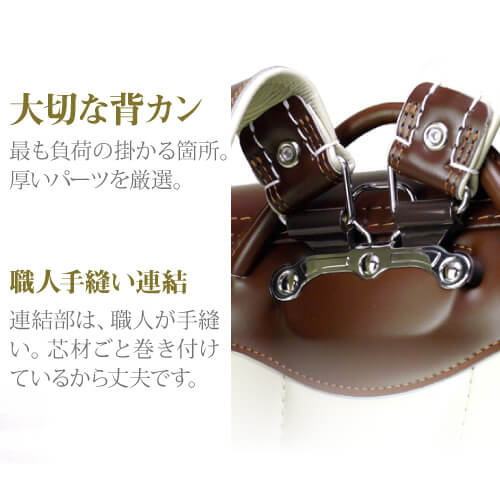 ランドセルの全重量を支える肩ベルトをつなぐパーツ「背カン」と「背カンと肩ベルトの連結部」には高い負荷が掛かります。