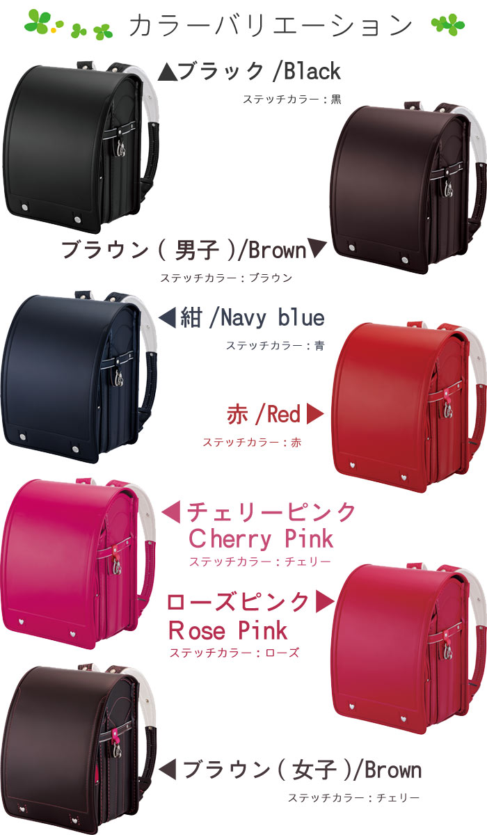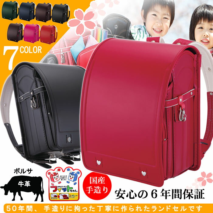 【素材】 カブセ・本体・背中・肩ベルト:牛革 【サイズ】 外寸:高さ32cm×横幅26cm×大マチ12cm 内寸:高さ32cm×横幅23.5cm×大マチ12cm 【重量】 1300g前後 【特長】 1、フィットちゃん使用 2、A4フラットファイル対応 3、ワンタッチ自動ロック錠 4、丸型の反射鋲 5、要所手縫い(3か所) 6、ワイドポケット 7、内装は人工皮革(無柄) 赤・ローズ・チェリー・ブラウン(女子用):ピンク色 黒・紺・ブラウン(男子用)・グリーン:黒色 8、防犯ブザー取り付け金具 9、背中はボンライン 10、両側安全ナスカン 11、ポケット内Dカン 12、付属品(ランドセルカバー、連絡袋) ■6年間無料保証、撥水加工 ■日本製 ※沖縄、北海道、九州、離島、一部地域に関しては別途送料が発生します。
